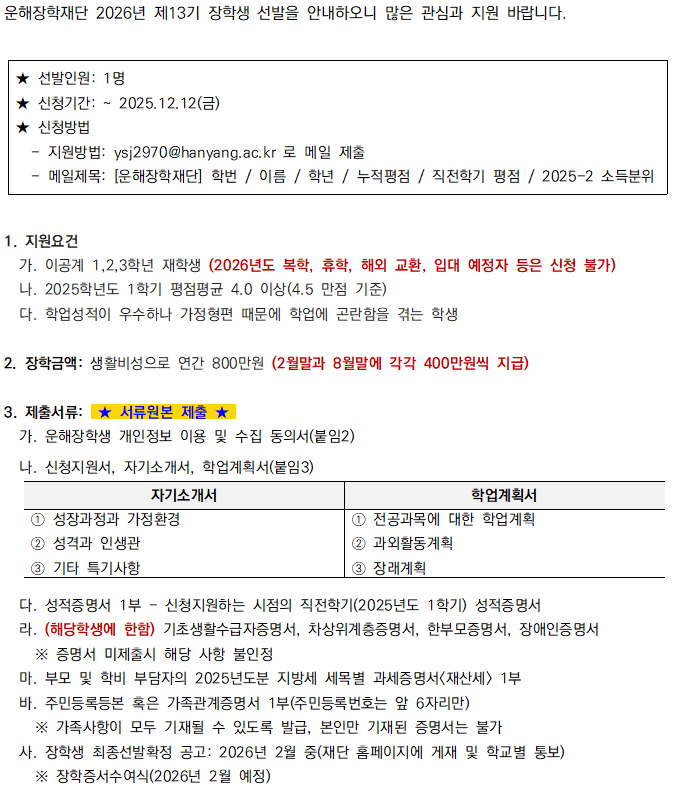 | [학부] 2026년 운해장학재단 제13기 장학생 선발 안내(~12.12) | ||