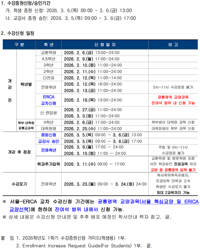 | [학부] 2026학년도 1학기 서울 학부 수강신청 및 개강 후 수강증원신청 안내 | ||