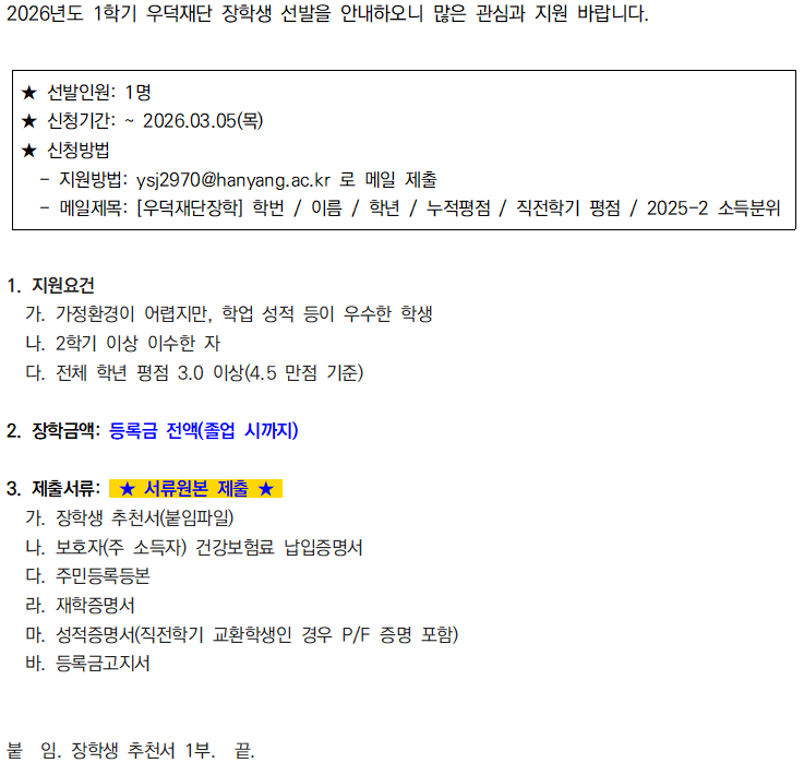 | [학부] 2026년도 1학기 우덕재단 장학생 선발 안내[~03.05(목)] | ||